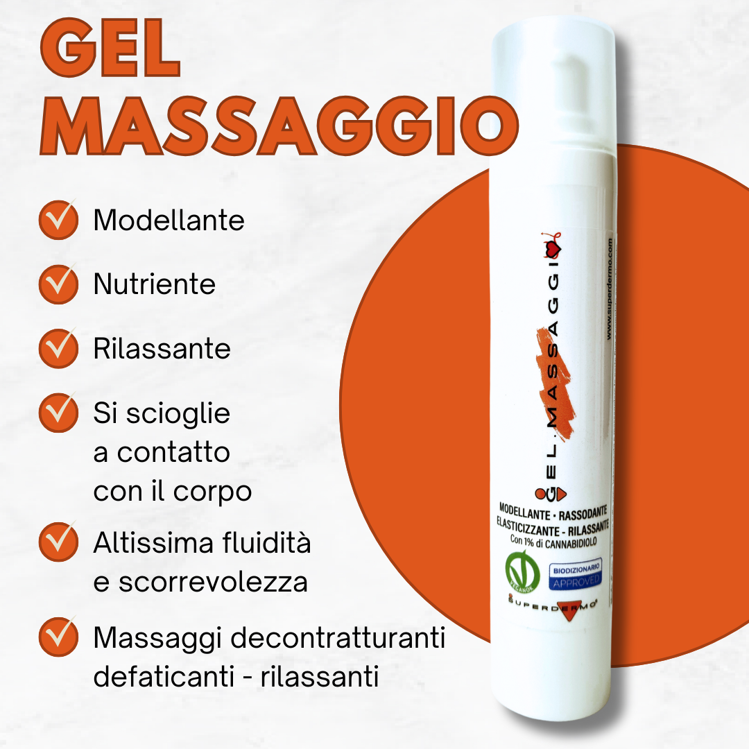 GEL MASSAGGIO è un innovativo olio in gel adatto al massaggio su tutte le parti del corpo, sia ad uso professionale, che in cabina di massaggio, che Home-care, ed espleta un’azione rilassante e antistress durante l’applicazione, grazie al contenuto di oli essenziali e cannabidiolo (CBD), mantenendo per tutto il massaggio un’elevata e piacevole scorrevolezza, donando elasticità e lucentezza alla pelle.